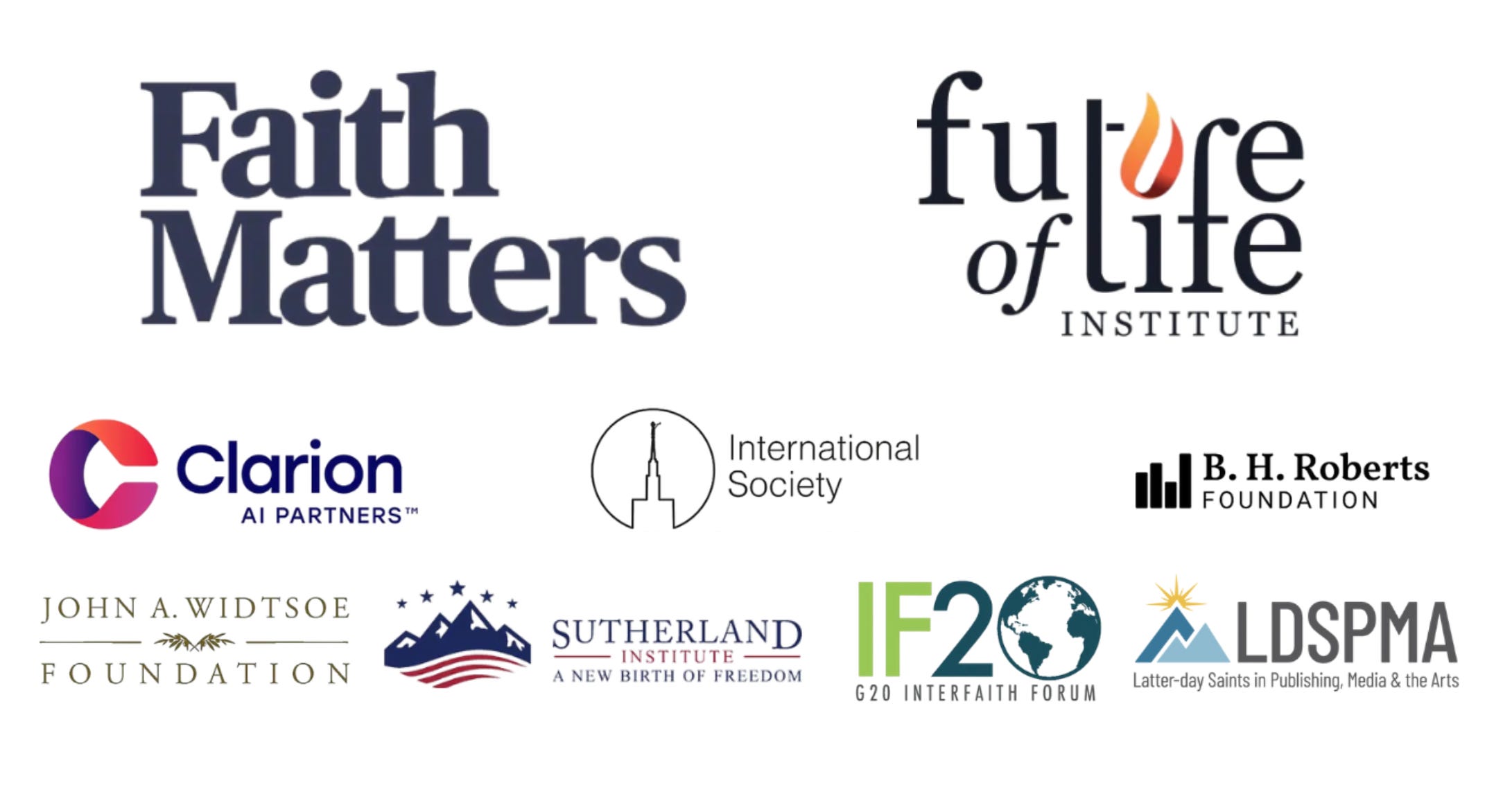 Future of Life Institute, Faith Matters, Clarion AI Partners, International Society, B.H. Roberts Foundation, John A. Widtsoe Foundation, Sutherland Institute, G20 Interfaith Forum (IF20), and Latter-day Saints in Publishing, Media & the Arts (LDSPMA).